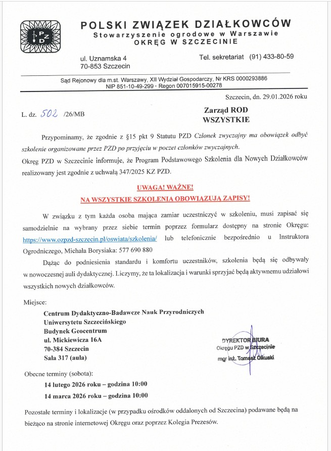 - Składka członkowska w wysokości 10,00 zł ( małżonkowie 2 x 5,00 zł, czyli 10 zł od działki ) – stawkę określa Rada Krajowa PZD.